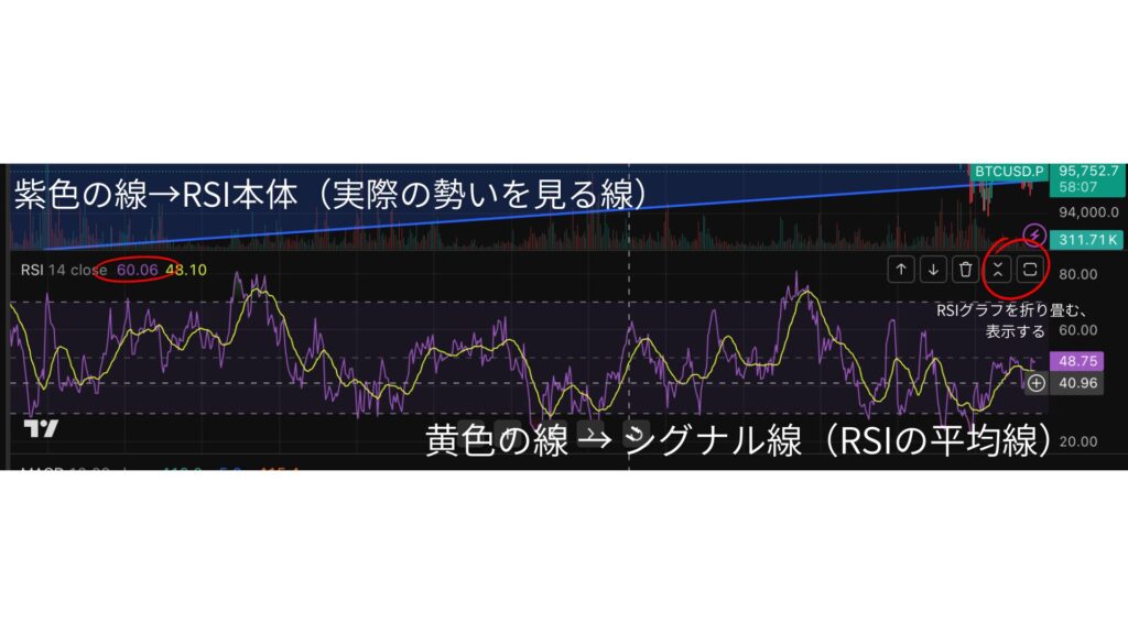 RSIは、価格の勢いを数値で示すインジケーター。チャート下に0〜100の数値グラフとして表示されます。