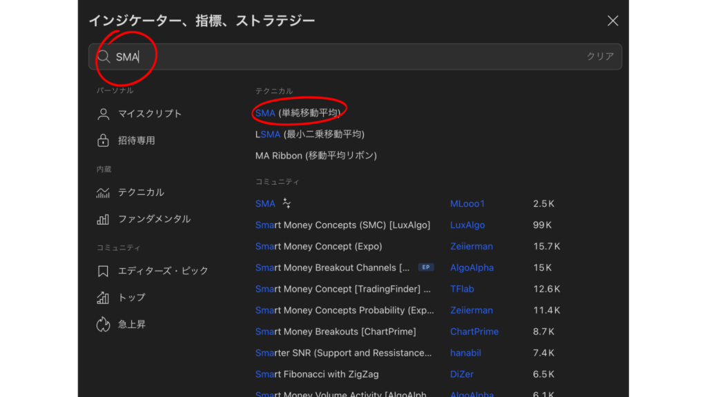 - ②検索欄に「SMA」「RSI」「Volume」などを入力