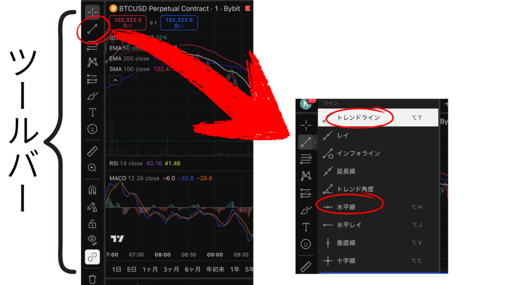 最初は上から2番目のラインツールから、よく使う「トレンドライン」と「水平線」だけ覚えればOK。