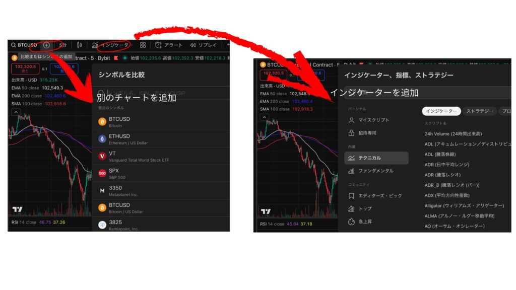 トレーディングビューでは、インジケーターを追加することで、相場の流れや勢いをよりわかりやすく分析できます。