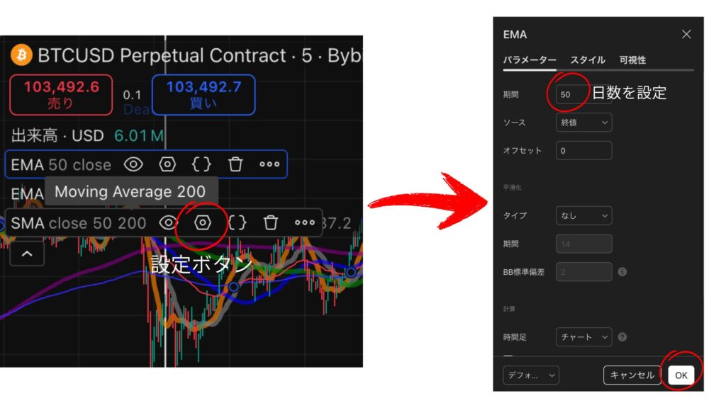チャートの左上に追加したインジケーター「SMA」が表示されるので、設定ボタンを推して移動平均線の日数を設定します。